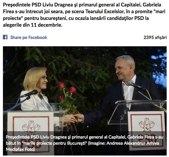 Print screen din articolul "REPORTAJ: Preşedintele PSD Liviu Dragnea şi primarul general al Capitalei, Gabriela Firea s-au bătut în "marile proiecte pentru Bucureşti" publicat de Mediafax: